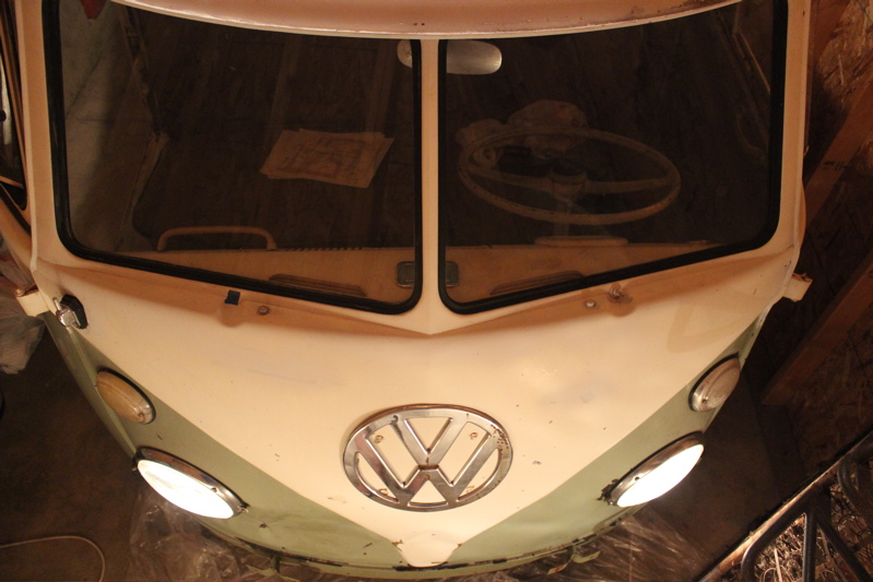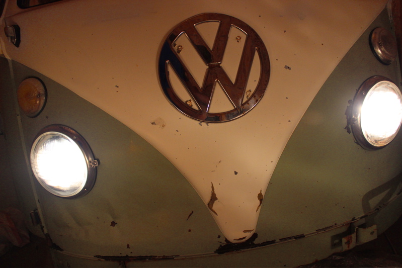 When I pulled the switch, I heard a small spark and the driver-side headlight came on. Partial success! The lazy side of me wanted to call it good, but I kept messing with it. As soon as I turned the lights off and tried to turn them on again, I got nothing. I used the test light to make sure the relay was getting power, but the lights wouldn’t come on. I figured the connector head on the wires might be too rusted (even though I cleaned them yesterday), or maybe that spark had fried the relay. Either way I’m a little pissed, and so I do what I do when I get pissed and start banging things around, pushing buttons, and generally throwing a little tantrum. During this episode, I was prodding and poking around with the test light, and accidentally shorted the live 56 wire with the yellow 56a wire leading to the headlights. A big spark this time, and both headlights came on bright. Success! The headlights are now in functioning order. Once again, I have “fixed” something on the bus by bumbling around and getting lucky. At this rate, I’m going to have this bus out on a road near you any day now; just need to get the turn signals working, brake lights, engine generator, windshield wipers, e-brake, and most likely a lot of other things done first. I’ll keep you posted!