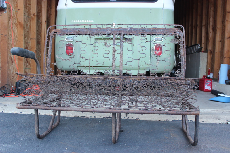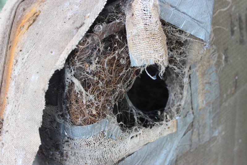 My bus came set up as a transporter with a full bench seat in the back, and a 2/3 middle seat. I don’t think they are original, and are probably not 1967 because they don’t have the handles across the top that identifies that year’s seats. I won’t need them for the camper conversion, so I’m hoping to sell them at some point. However, before I can do that I need to get them out of the bus and cleaned up… starting with the middle seat. I mentioned the intrepid bus spiders in an earlier post, and the middle seat is their home base. From the pictures you can see that I have an infestation. I was able to get the seat out of the bus easily enough, and set it up in front of the garage. What followed was a few hours of cleaning out decades of spider nest and squirrel poo – fun times!