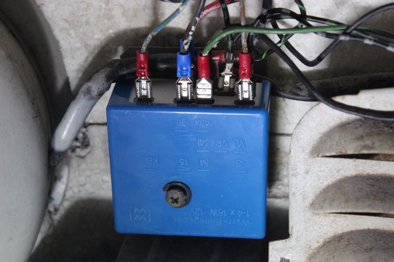 Turn Signals work.  Well not really, but it was fun to stay it with so much confidence.  The replacement 9-pin relay I ordered from Wolfsburg West arrived, and I happily plugged all of the wire connectors in hoping for the best.  When I turned the key and flipped the blinker switch down, the driver’s side turn signal started flashing regularly – Success!  When I flip the switch up, the passenger side flashes, but its twice as fast.  So not a total success, but still they light up!  I’m going to clean/ replace the rest of the connectors to see if that solves the flashing problem.