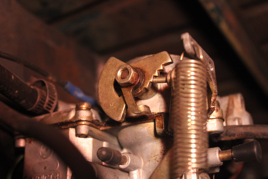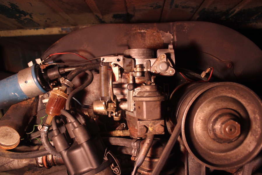 I’ve been trying to learn myself about the carburetor, and I’m getting more comfortable messing with it. Eventually I will either rebuild it, or get a new one; right now, I just want to make sure it is working. First thing I did was check the automatic choke. To start, I loosened the fast idle screw (name is deceptive, doesn’t actually have anything to do with setting idle speed). As I turned the screw, the screwdriver with adjustable head slipped – Clink!… Great, just great! I dropped the little screwdriver head somewhere on the engine, can’t find it, oops. Once again, the little steel pick, that I used to get the broken key out of the ignition, came in handy – I found the little screwdriver head and kept going. Ok everything adjusted up, bus runs but still dies at idle, still seems to run hot. I’m going to keep messing with it, will try to reset the timing and check the valves again. I’m also thinking about replacing the fuel pump and filter set up, and replacing the fuel lines.