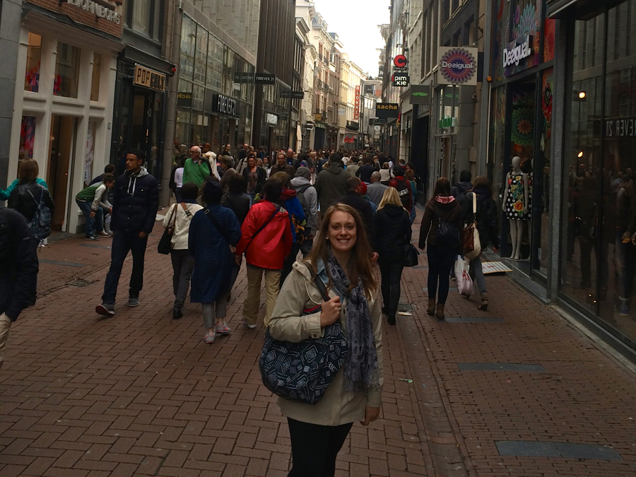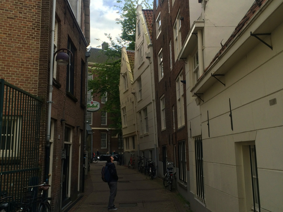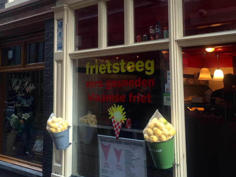 We walked down the busy Damrak street, saw the Dam Square monument, the Royal Palace, and did some souvenir shopping.Busy Street!Damrak StWooden ClogsWe stopped to eat some friets (French fries in a cone, covered in a thick mayonnaise sauce) from a little place off Spui Square. It was nice to sit and take in the all of the activity around us.FreitsI looked at some leaning buildings.Not quite straightThe walk ended in Leidseplein where we decided to find some dinner.  After being beckoned by numerous mater de’s from the touristy alleyways, we found a nice little eatery tucked back in a corner.  It had a little chalkboard menu and perfect outdoor seating… but we didn’t eat there… I decided it was probably too expensive and wouldn’t be right – so we kept looking. Except that now we were getting hungrier and the wind was picking up and it was getting later. I started to panic a little, torn between spending too much on a meal and falling for the tourist restaurant trap.  I didn’t know what to do – the h’anger (hunger anger) was setting in and we needed to eat… fast!