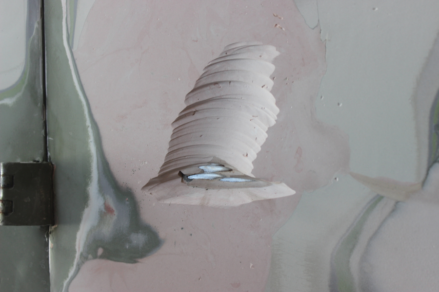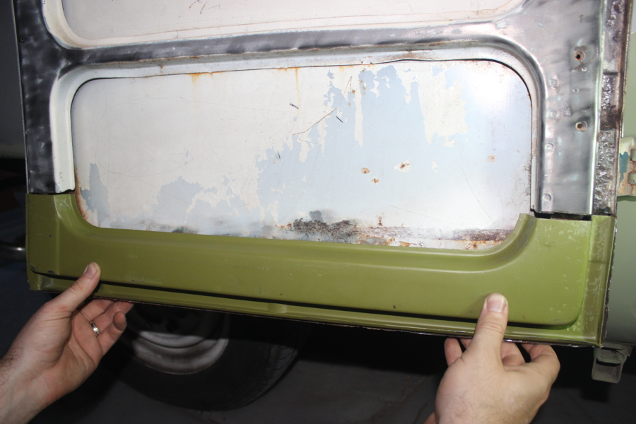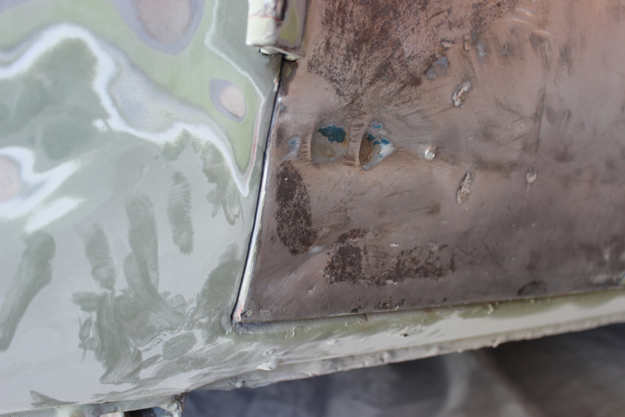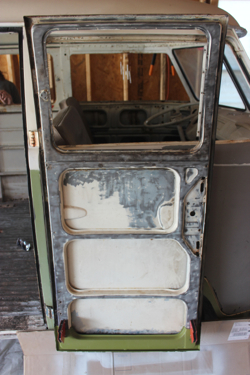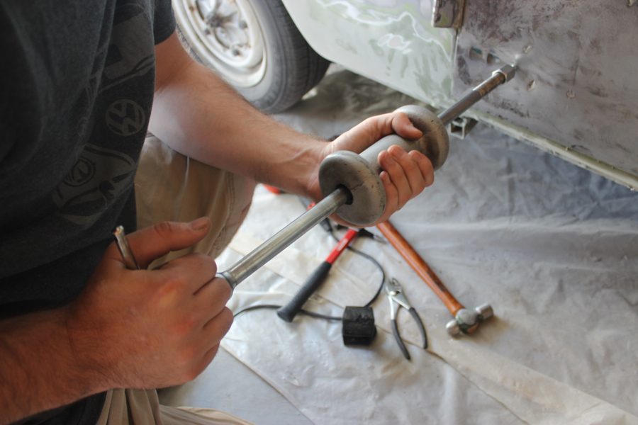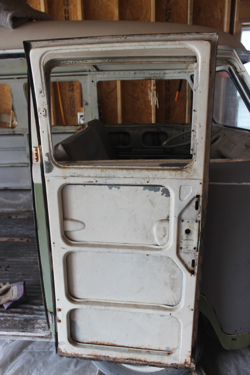 After getting the inside of the cargo doors welded and cleaned up, I started in on the exterior. This was the bondo hell that I posted about a while ago – after chipping away all of the inch-thick, cracked body filler, I used a slide hammer and hammer/dolly to get the metal back into shape (at least as close as I could). I then went full circle and started to add Bondo back to the side!