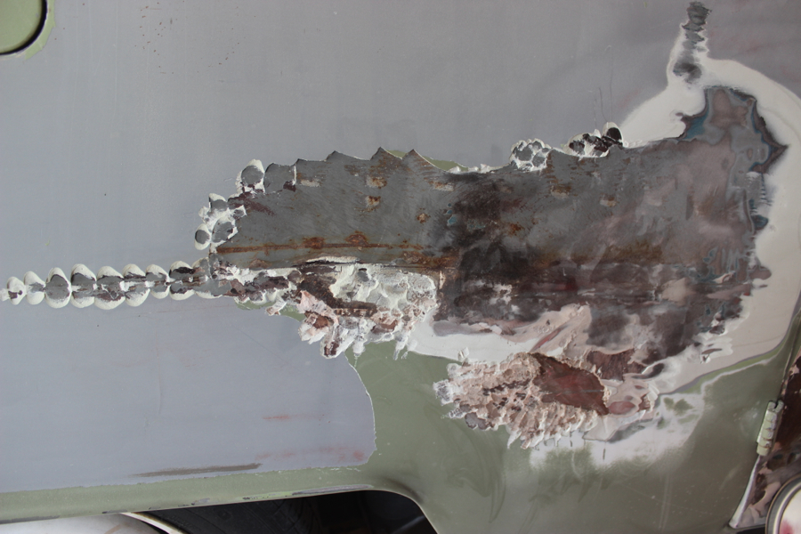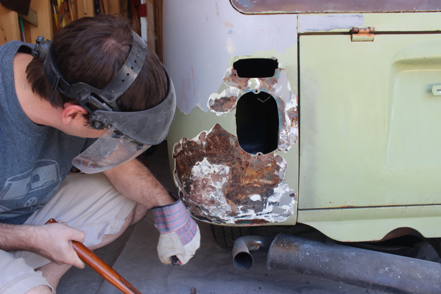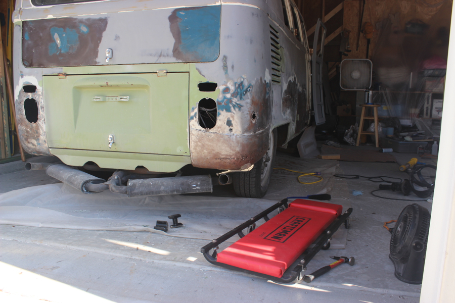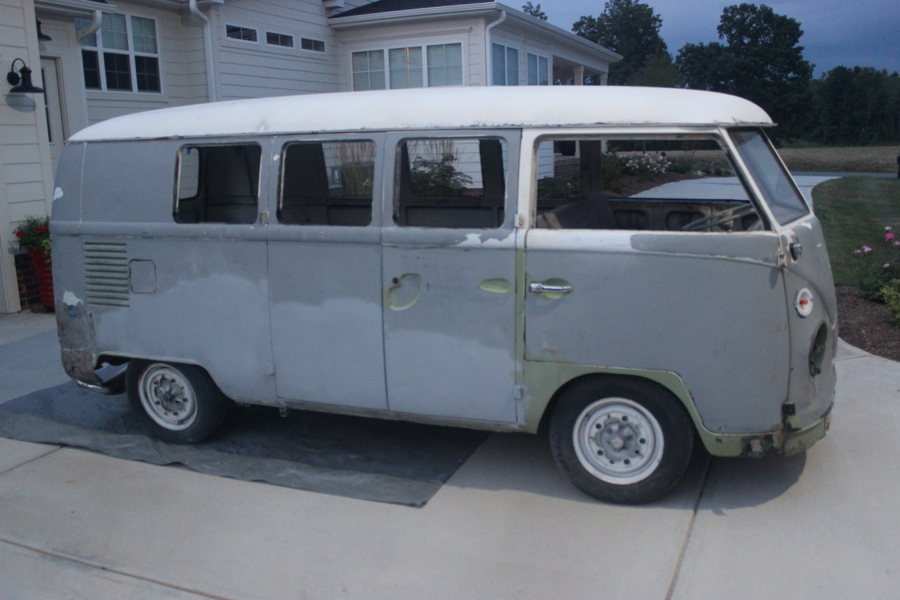 Ok so once I get the passenger side done and primered, I will move on to the back end corners and back hatch, and probably the battery tray – then move on to the front dent, then fix the floor when the part comes, then weld the new B and C pillars, then finish cleaning up the interior and the front dash area, then clean each wheel well and weld holes and undercoat the bottom with my POR truckbed liner, then pull the engine and gas tank and fix all that up, then get the electrical put back together, then work the dents out of the front bumper and get those things primered and painted, then get all the window frames and pop out frames cleaned up and reinstalled, then get the safaris installed, then get this stupid bus painted, and at some point I need to go through the brakes and lube up the wheels, then get all the new rubber seals installed (even though we all know they won’t actually fit) then get the camper kit built, and the seats redone, then do some fun stuff like add a second battery and get the food chuck wagon box built, then … well by then I’ll be like 85 and Noelle and I will reminisce about that one summer when we thought we could fix up a VW bus and drive it around the country – crazies!!