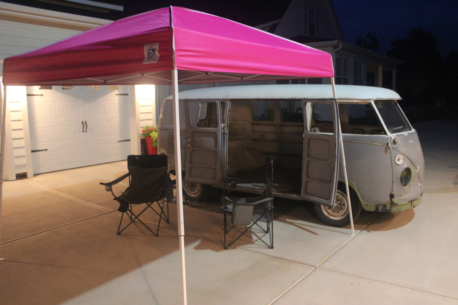 Got Carla and Norm’s 10′ by 10′ awning out to see how it fit next to the bus – I like the size, but hot pink… I’m not sure about that! Feels good to see what life might be like when I finally get this thing all done.