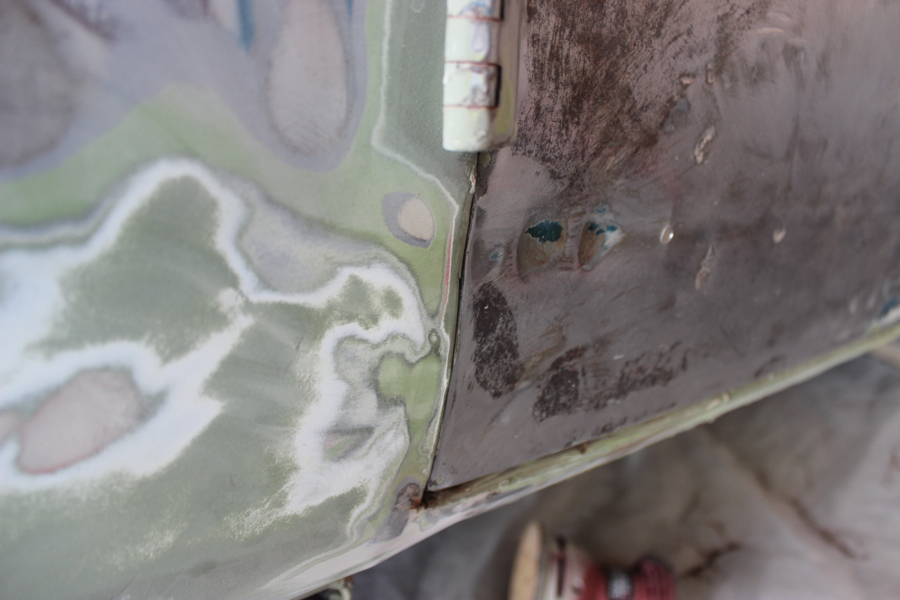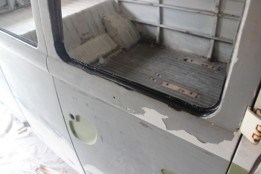 I also cleaned up the window frames and drip rail along the roof – added a couple coats of POR 15 (this stuff dries to a hard shell and is awesome/ expensive!!). I fiberglassed the few holes in the window area, and will add some finish putty to smooth everything out.