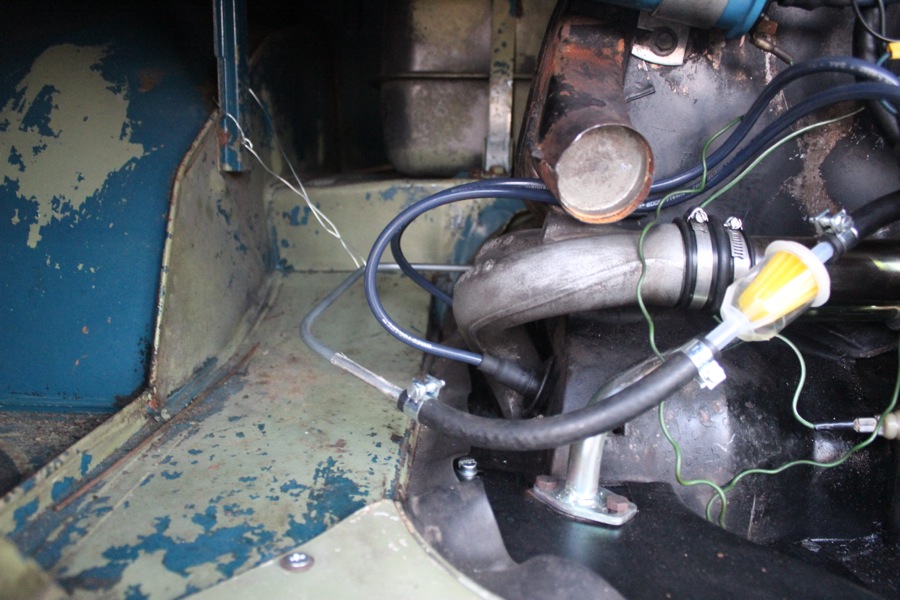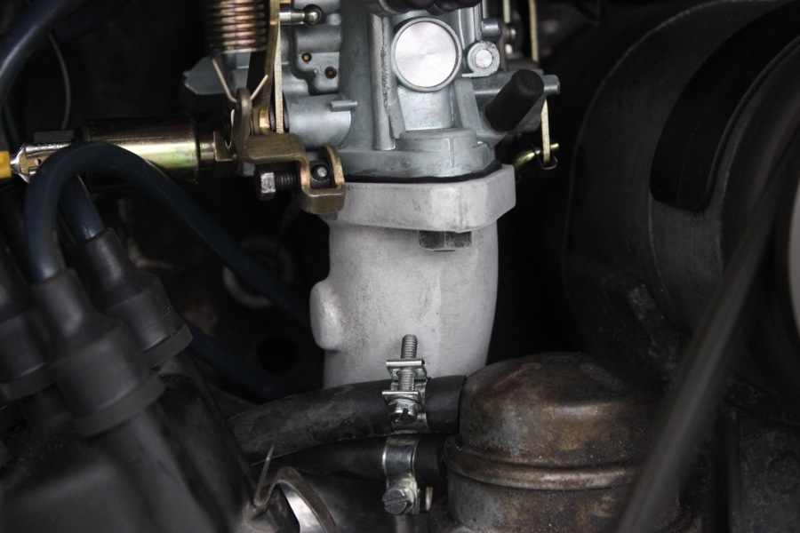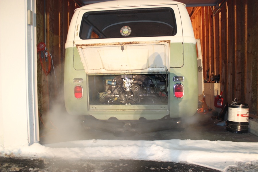 Finally, I braved the cold and wet weather to test drive the bus some more. It performed beautifully! I backed the thing out of the garage, shifted smoothly into first and then second gear, drove around the parking lot. I came to the dreaded stop sign where I’ve had so much trouble before – the engine either dies as I brake, or it coughs and dies as I shift in first to get going again – but this time, the engine dropped to a solid idle as I came to a stop, and did not hesitate as I got going again. Success!